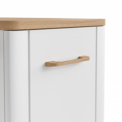- Приятная цветовая палитра. Белый оттенок корпуса и фасадов разбавлен элементами с текстурой светлого дуба вотан.