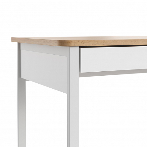 - Выдвижной ящик. Под столешницей предусмотрен широкий белый ящик для хранения канцелярских принадлежностей, бумаг.