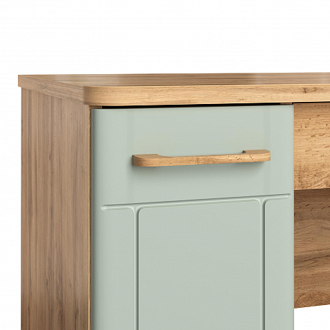 - Приятная цветовая палитра. Эвкалиптовый оттенок фасадов разбавлен столешницей и элементами с текстурой светлого дуба вотан.