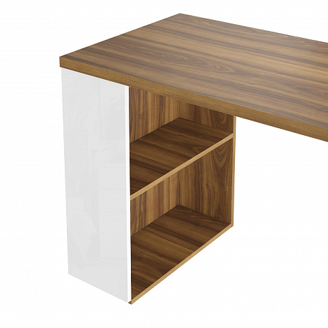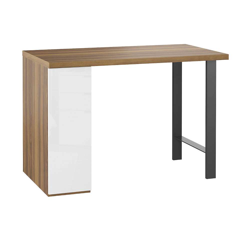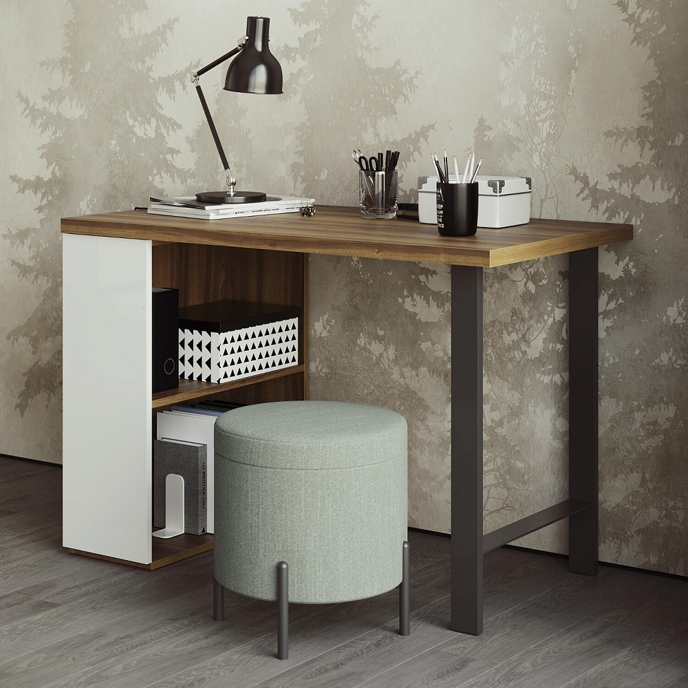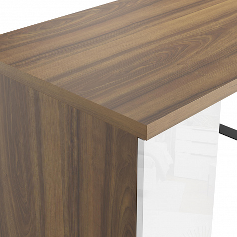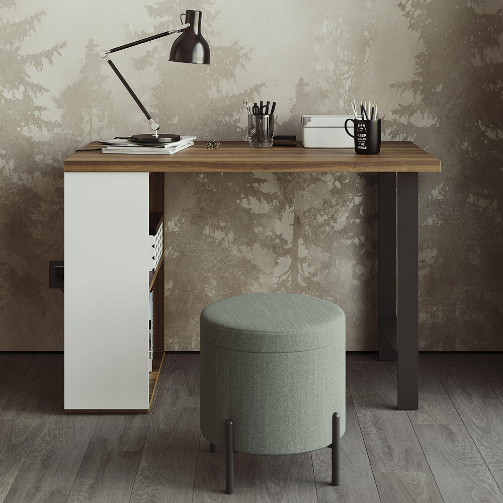 - Приятный дизайн. Сочетание столешницы с текстурой дерева, вставки белого цвета и металлической опоры делают модель оригинальным предметом интерьера.