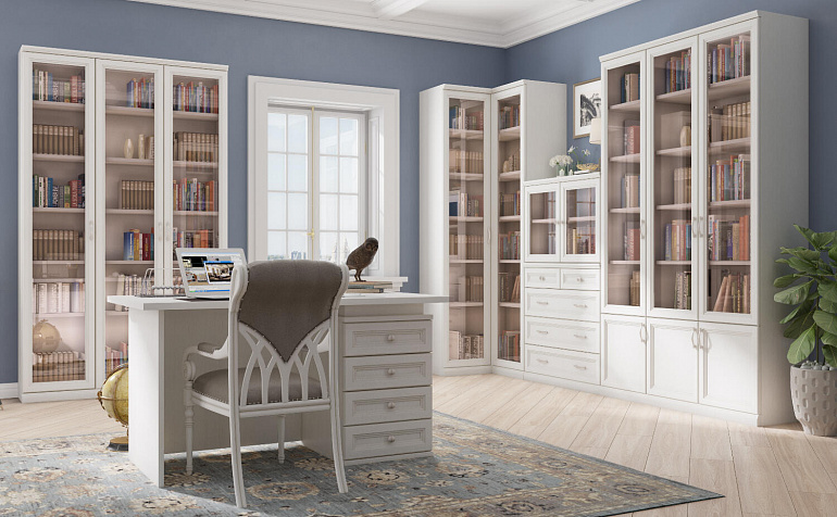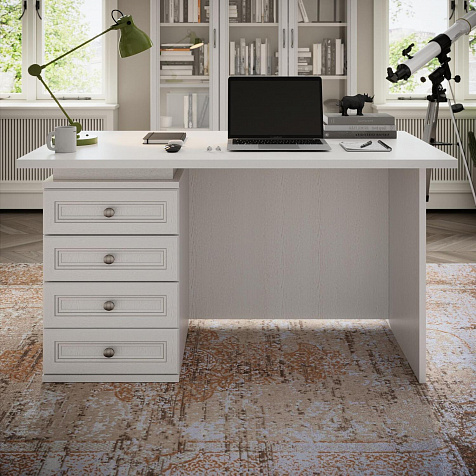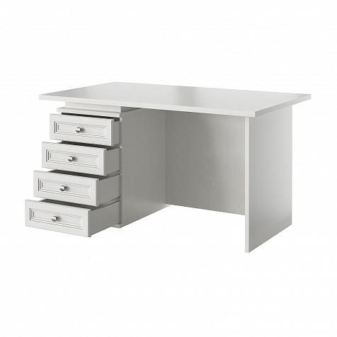 Правый письменный стол «Белладжио» с просторной столешницей и тумбой позволит оформить удобное рабочее место как в домашнем офисе, так и в кабинете руководителя. Элегантная модель с объёмной рамкой на фасадах, декорированной изящной патиной, органично впишется в интерьер в стиле неоклассика, лофт или прованс.