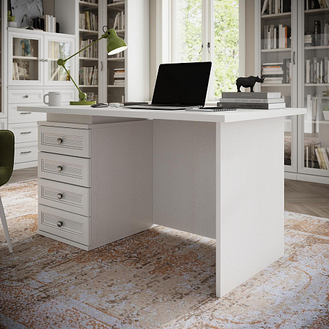 Правый письменный стол «Белладжио» с просторной столешницей и тумбой позволит оформить удобное рабочее место как в домашнем офисе, так и в кабинете руководителя. Элегантная модель с объёмной рамкой на фасадах, декорированной изящной патиной и вставками из натурального бамбука, органично впишется в интерьер в стиле неоклассика, лофт или прованс.