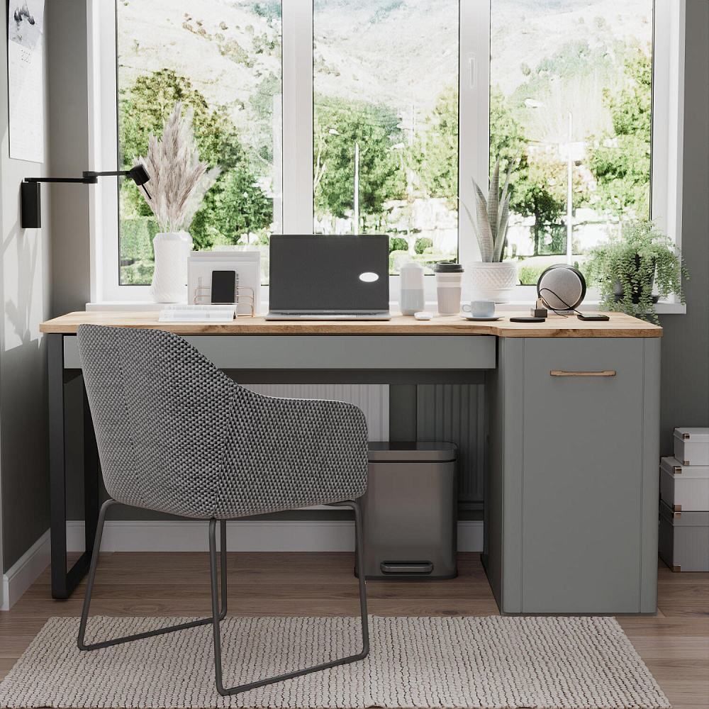 - Приятная цветовая палитра. Серый оттенок корпуса и фасадов разбавлен столешницей и элементами с текстурой светлого дуба вотан.