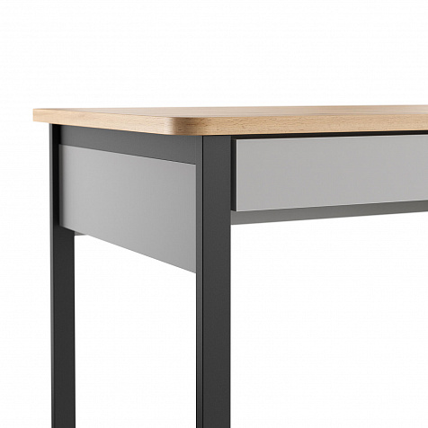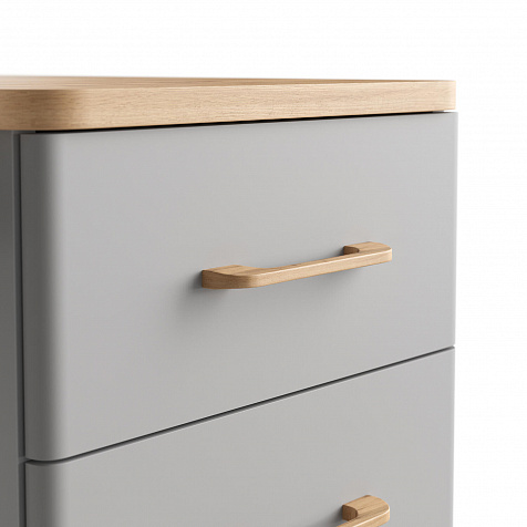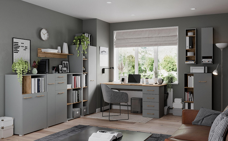 - Приятная цветовая палитра. Серый оттенок корпуса и фасадов разбавлен столешницей и элементами с текстурой светлого дуба вотан.
