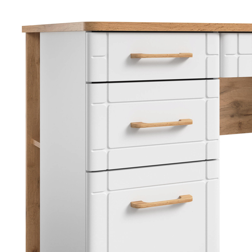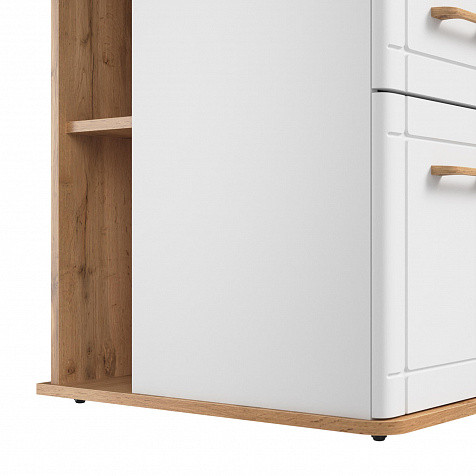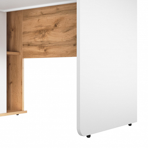 - Приятная цветовая палитра. Белый оттенок корпуса и фасадов разбавлен столешницей и элементами с текстурой светлого дуба вотан.