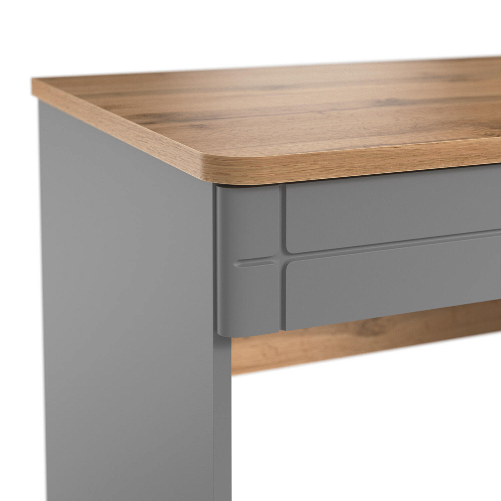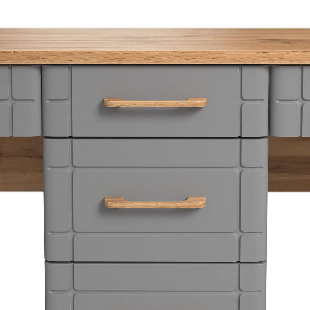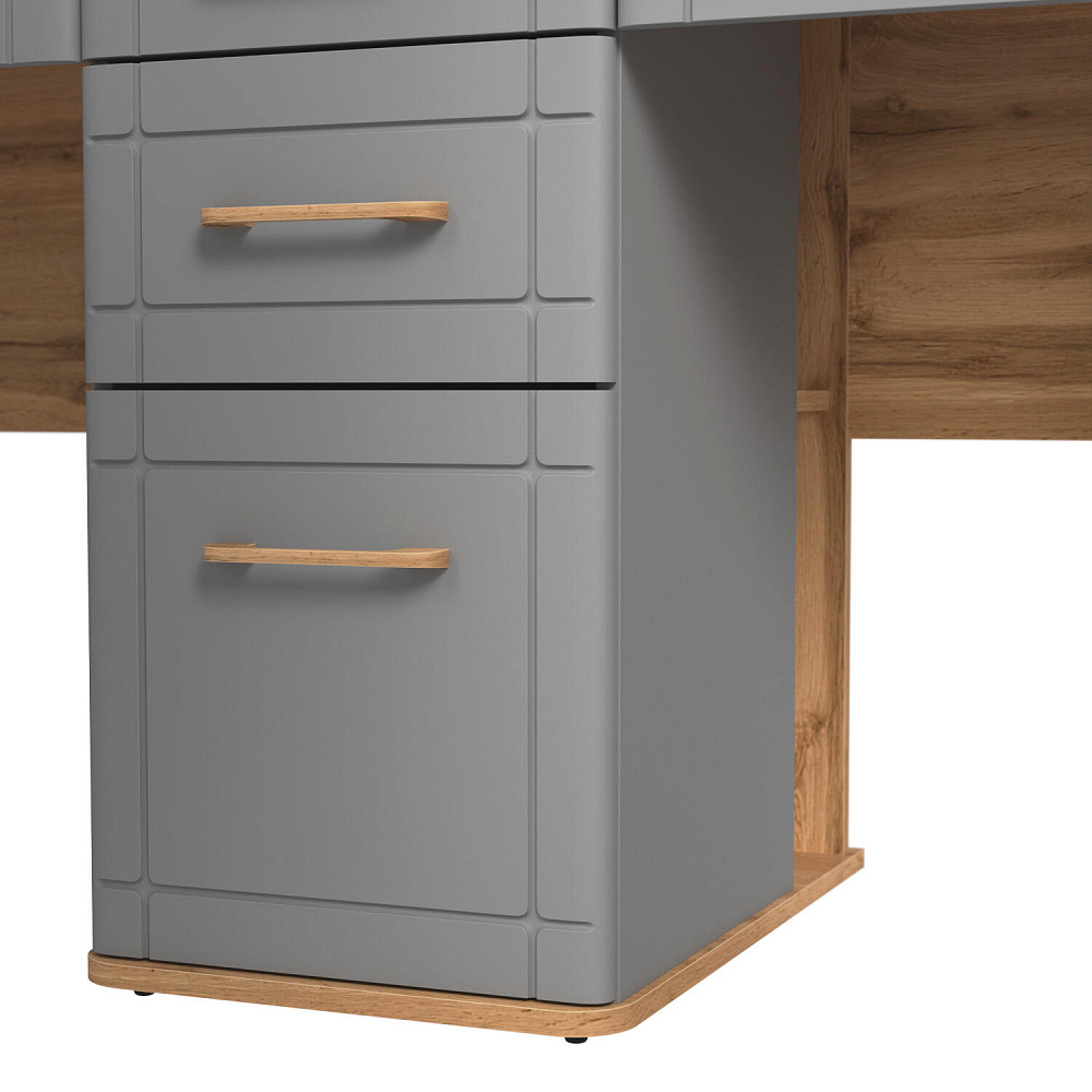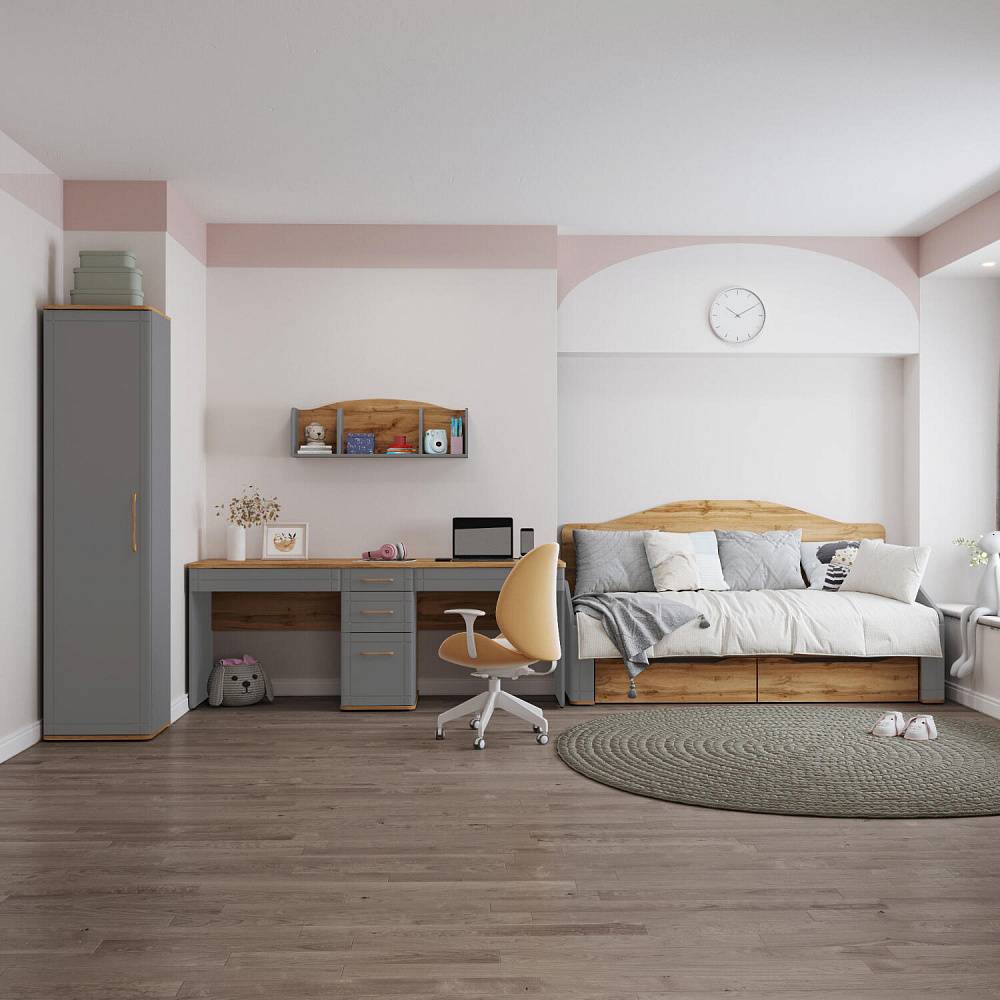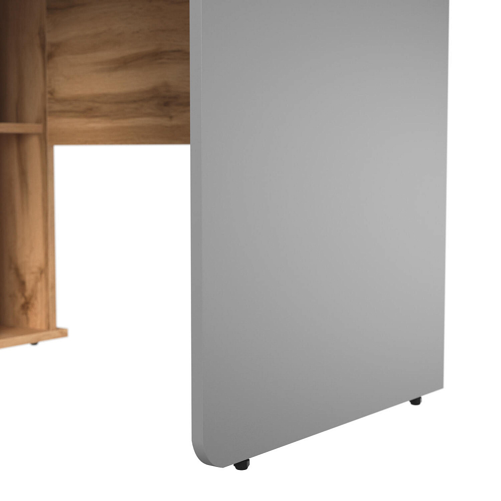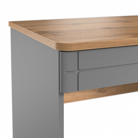 - Приятная цветовая палитра. Серый оттенок корпуса и фасадов разбавлен столешницей и элементами с текстурой светлого дуба вотан.