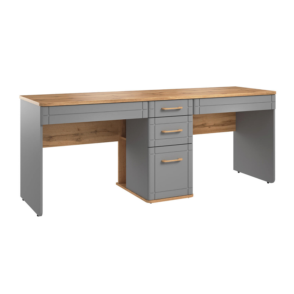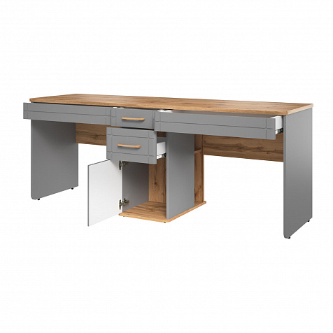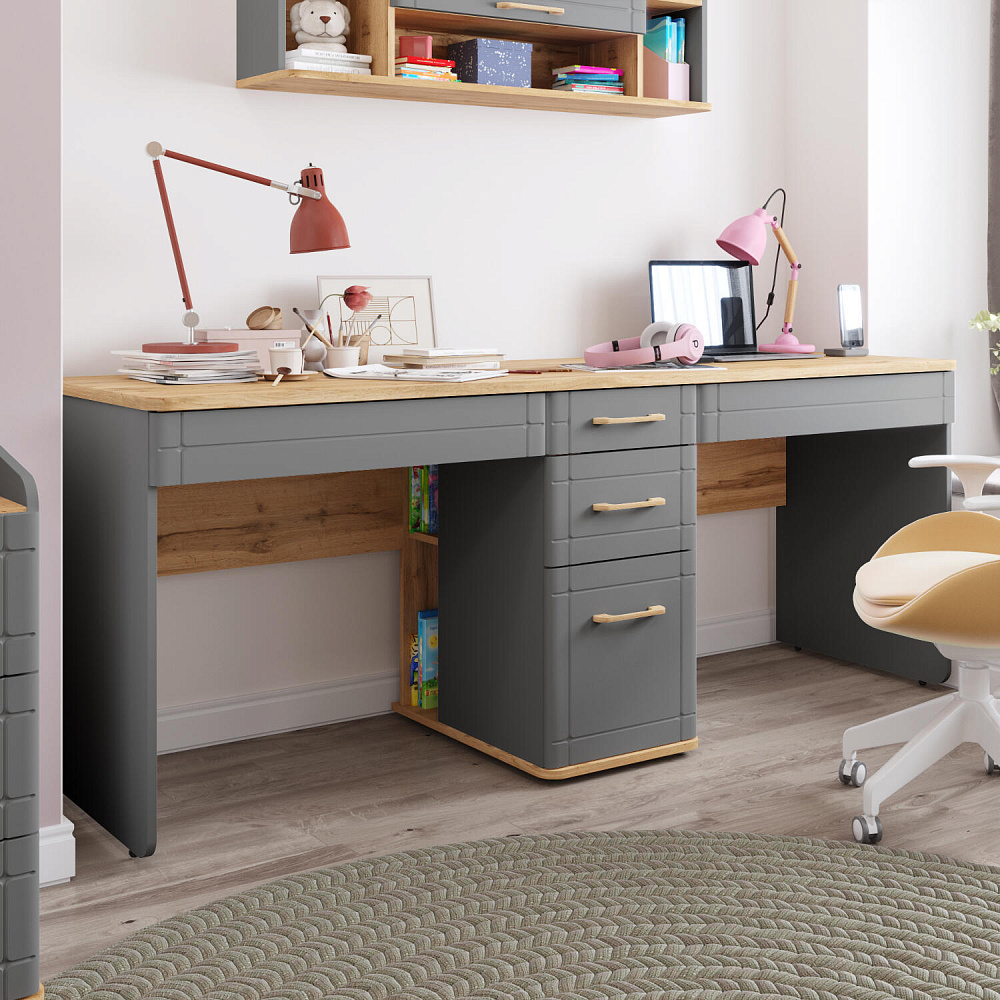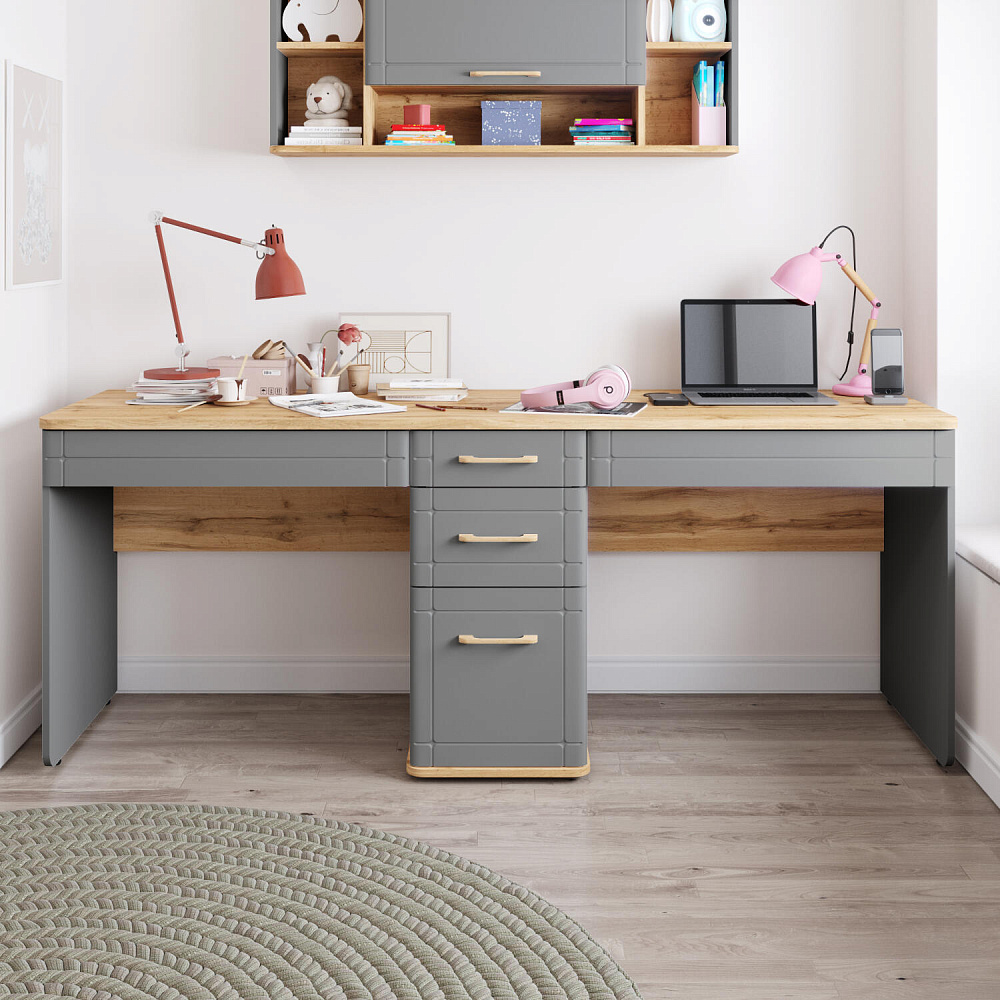 Двойной письменный стол «Кассия» с четырьмя ящиками и закрытым отделением для школьных принадлежностей украсит современную детскую комнату. Он станет уютным и комфортным местом для выполнения домашних заданий и занятий любимым хобби. Современный дизайн модели выполнен в универсальной цветовой гамме, которая подходит к самым разным стилям оформления.
