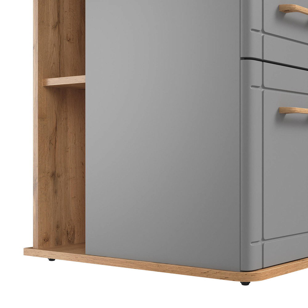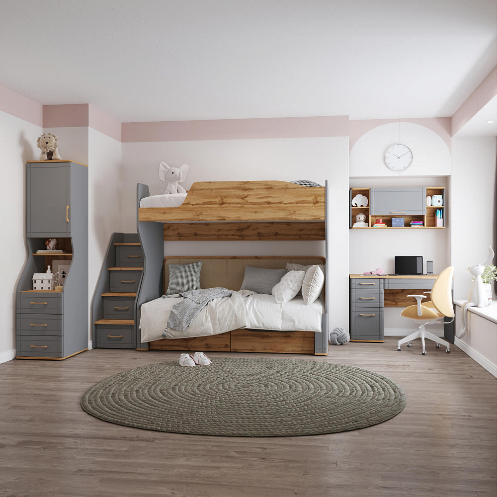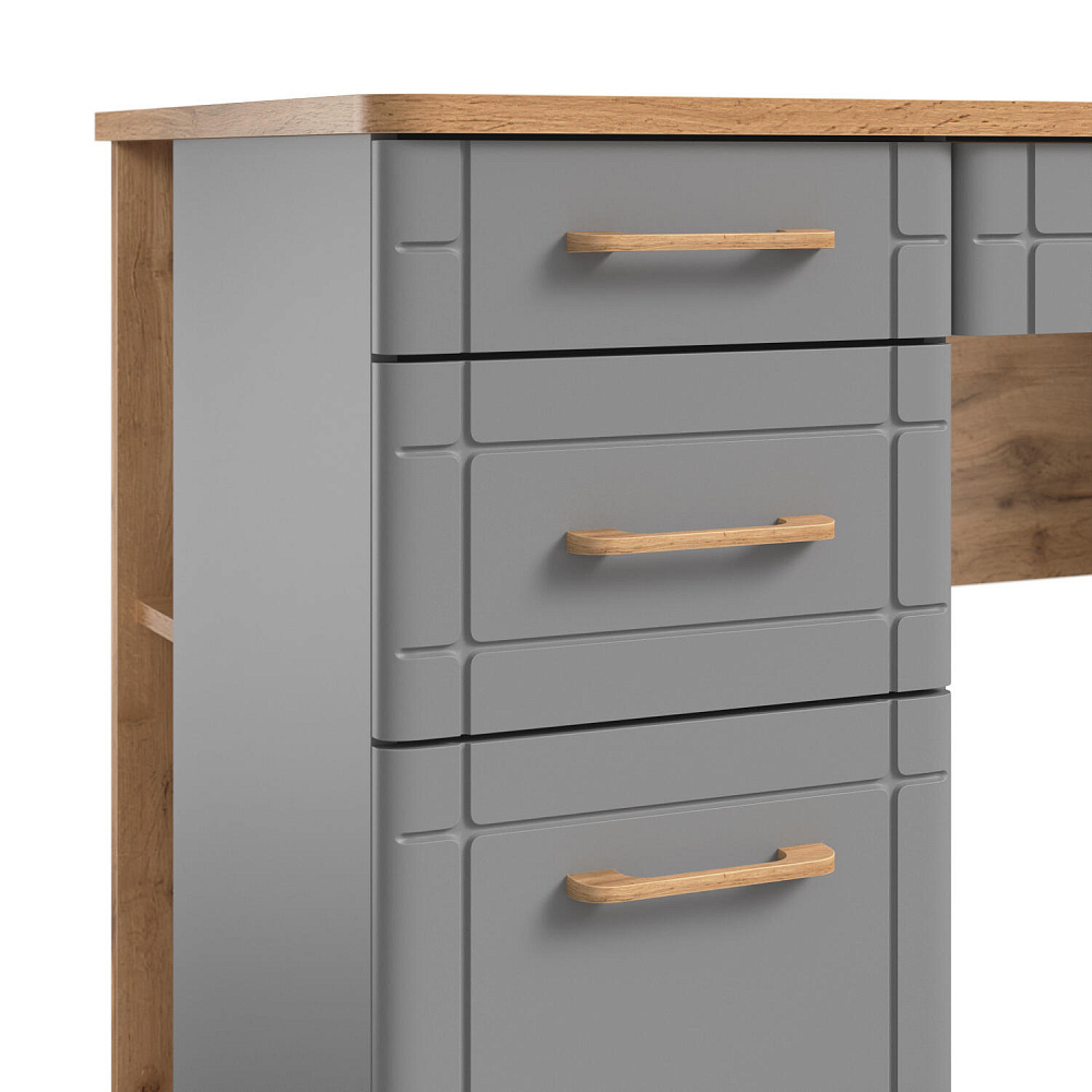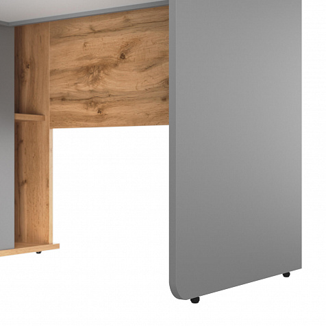 - Приятная цветовая палитра. Серый оттенок корпуса и фасадов разбавлен столешницей и элементами с текстурой светлого дуба вотан.