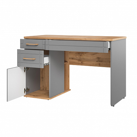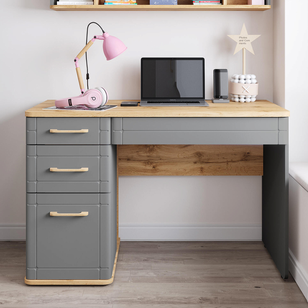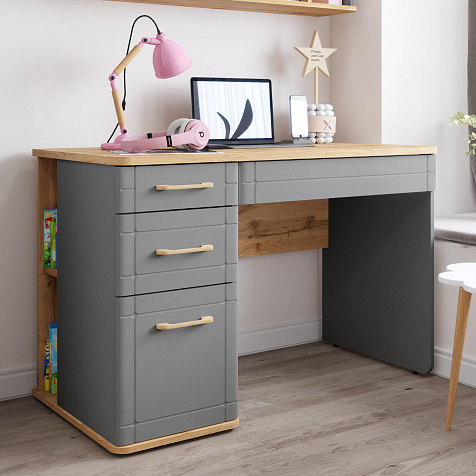Широкий письменный стол «Кассия» с тремя ящиками и закрытым отделением для школьных принадлежностей украсит современную детскую комнату. Он станет уютным и комфортным местом для выполнения домашних заданий и занятий любимым хобби. Современный дизайн модели выполнен в универсальной цветовой гамме, которая подходит к самым разным стилям оформления.