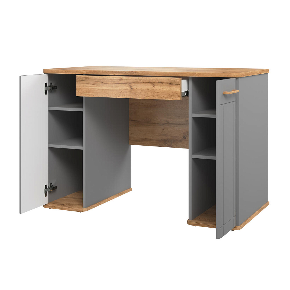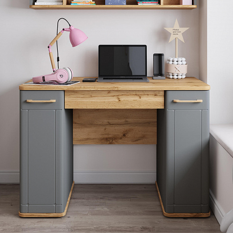 Широкий письменный стол «Кассия» с широким ящиком и двумя закрытыми отделениями с полками для школьных принадлежностей украсит современную детскую комнату. Он станет уютным и комфортным местом для выполнения домашних заданий и занятий любимым хобби. Современный дизайн модели выполнен в универсальной цветовой гамме, которая подходит к самым разным стилям оформления.