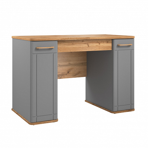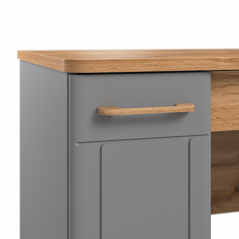 - Приятная цветовая палитра. Серый оттенок корпуса и фасадов разбавлен столешницей и элементами с текстурой светлого дуба вотан.