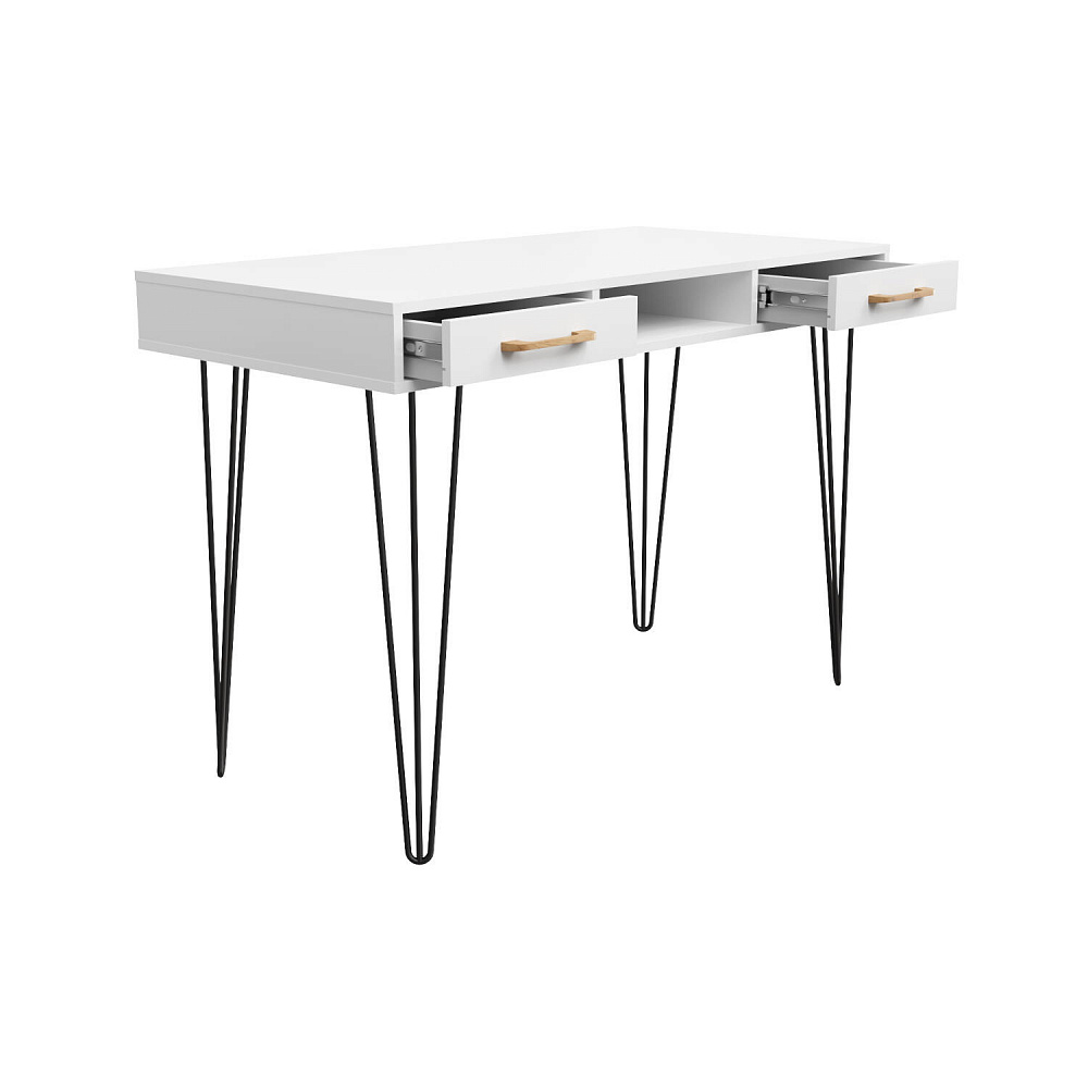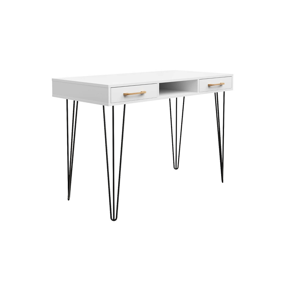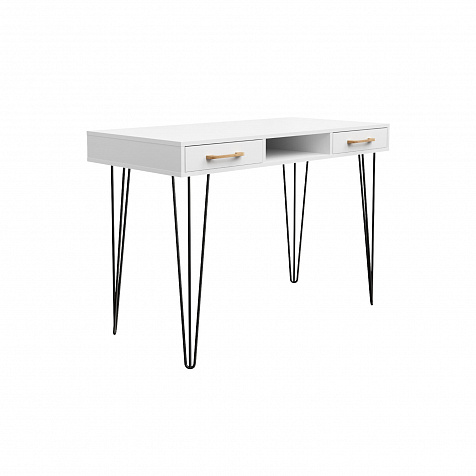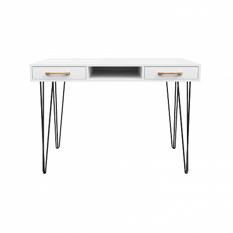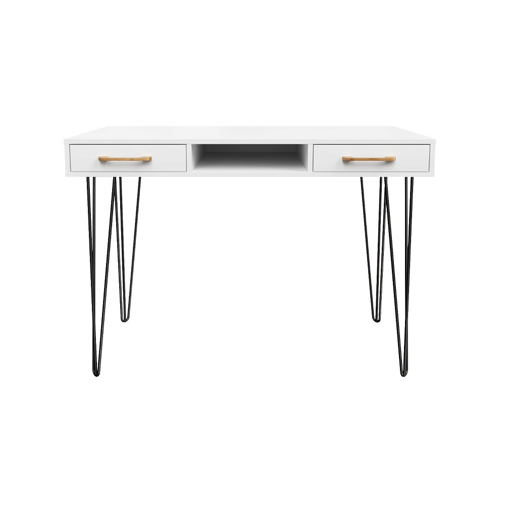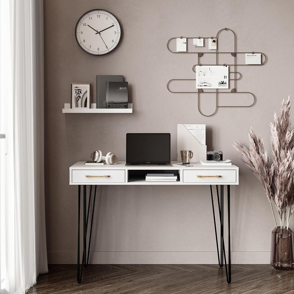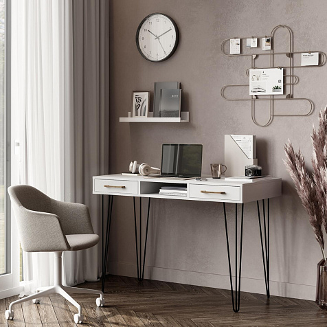 Письменный стол «Кассия» с нишей и ящиками — функциональная и компактная модель в стиле лофт подойдет для создания рабочего места в домашней обстановке. Благодаря компактным габаритам за столом можно комфортно расположится с ноутбуком, учебниками и тетрадями, при этом стол не займет много места в комнате. Модель оснащена двумя широкими ящиками, где можно хранить множество различных вещей. Комбинация тонких металлических опор с универсальной цветовой гаммой подойдет к любому стилю оформления помещения.