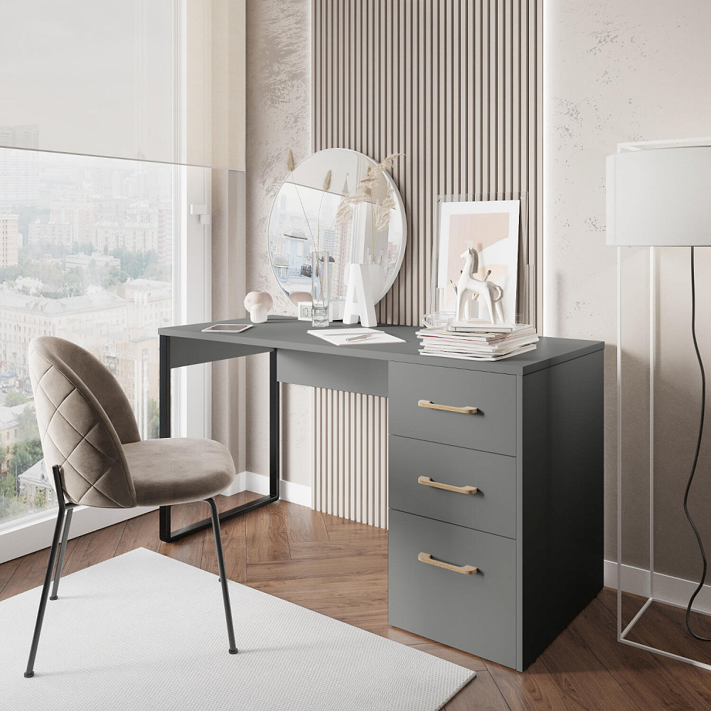 Письменный стол «Кассия» с ящиками — лаконичная модель в стиле лофт подойдет для создания рабочего места в домашней обстановке. Благодаря просторной столешнице за столом можно комфортно расположиться с ноутбуком, при этом останется свободное место для настольной лампы, бумаг и других вещей. Модель оснащена тремя ящиками, где можно хранить множество различных вещей. Современный дизайн модели подойдет к любому стилю оформления помещения.