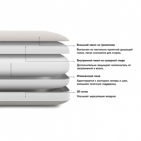 Подушка классической формы «Латте» гарантирует оптимальное положение головы во время сна. В её состав входит высококачественная итальянская пена, обеспечивающая идеальный баланс мягкости и упругости. Наполнитель адаптируется к контурам головы и шеи, оказывает точечную поддержку и снимает напряжение. Нежный чехол из тактильно приятного трикотажа защищает пену от загрязнений и при необходимости легко снимается для стирки. Специальная 3D сетка по периметру подушки способствует циркуляции воздуха и предотвращает перегрев.