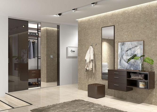 Шкаф полностью встроен в существующую нишу. То есть боковины, крыша, пол и задняя стенка шкафа оказались не нужны ‒ их функции выполняют непосредственно стены помещения. В качестве дверей-купе выбраны безупречно красивые безрамные двери “Шифт” (производство ‒ “Noteborn”, Нидерланды). Для отделки лицевой стороны дверей выбрано зеркало “Серебряное” и декоративное стекло “Антрацит”. Для комфортного использования прямо на стекло установлены ручки на клеевой основе “Кутюр”. При необходимости двери можно дополнительно укомплектовать доводчиками.