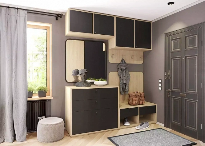 Прихожая (арт. 101) — контрастный вариант для квартиры-студии и не только. Она включает в себя удобную тумбу с зеркалом, навесные шкафы с вешалкой и обувницу. С помощью этого гарнитура вы сделает вход в дом максимально комфортным.