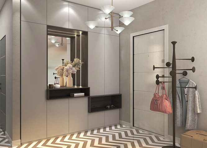 Прихожая (арт. 102) — это решение для тех, кто предпочитает встроенную мебель. Шкафы от пола до потолка полностью занимают нишу, при этом предусмотрено большое зеркало с подсветкой NET.