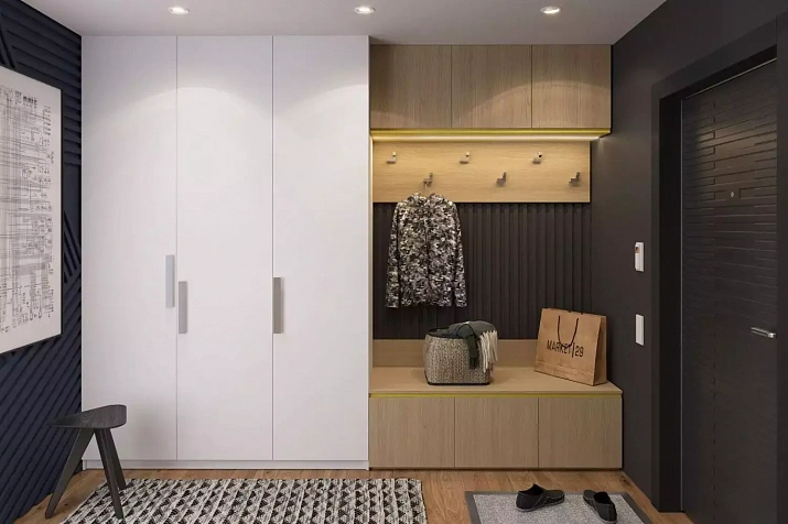 Ключевое преимущество данной композиции — это ее размеры и возможности. В большой шкаф можно без проблем сложить и повесить зимние и демисезонные вещи, головные уборы поместятся в верхний навесной шкаф. А для повседневно используемых останутся крючки на вешалке и противоположной стене рядом с зеркалом. Там же можно разместить сумки, зонты, пакеты — что угодно, и ещё место останется.