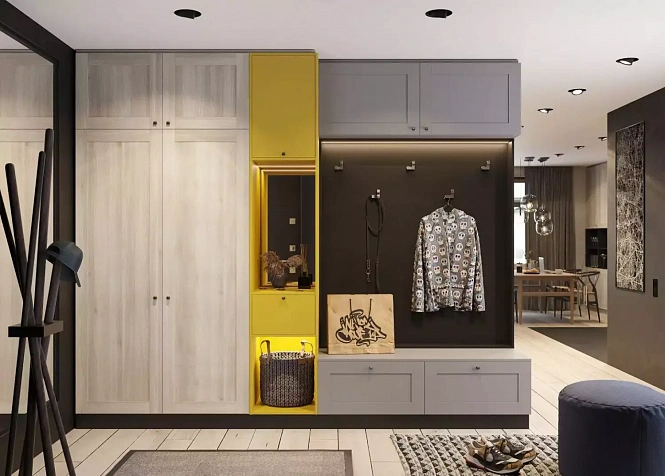 Корпус прихожей изготовлен из ламинированной плиты в декорах “Гейнсборо” и “Акация” с имитацией текстуры дерева. Панель открытой вешалки с крючками выполнена в декоре “Ситивуд черный”. Яркие желтые цвета пенала - ;Эмаль RAL (1023). На всех фасадах установлены небольшие изящные ручки “Колибри”. Внутреннее наполнение, внешние параметры и декоративные элементы — все это создается по индивидуальному проекту для каждого заказчика.