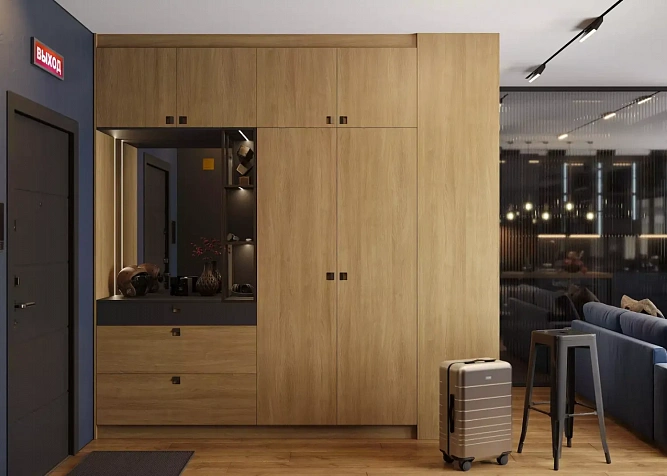 Фасады той части, что расположена в прихожей, выполнены из ЛДСП с фрезерованной ручкой Slider. Декоры совпадают с корпусом.