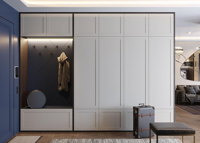 За сплошной линией фасадов распашных шкафов и вешалки-ниши с антресолями и обувной тумбой-сиденьем скрываются распашные шкафы. Изящный образ прихожей дополняет мягкая подсветка.