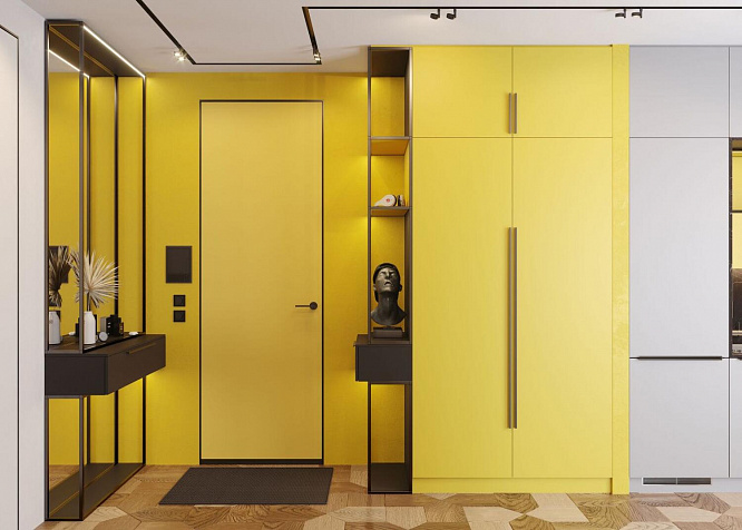 Выполненные из ЛДСП корпус и фасады в декоре «Гейнсборо» и желтом цвете - в эмали RAL (1023). Они визуально осветляют помещение прихожей. А их внутреннее наполнение способно вместить большое количество вещей