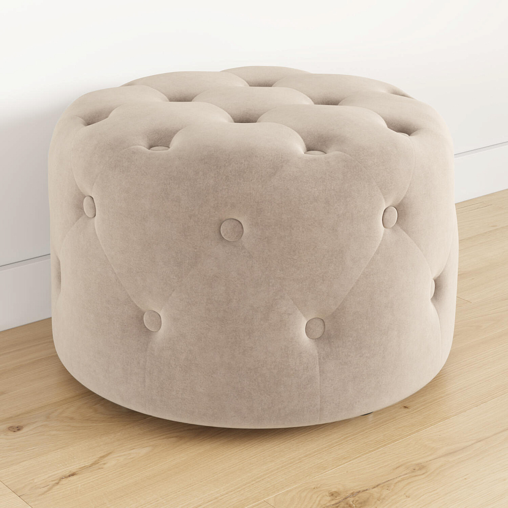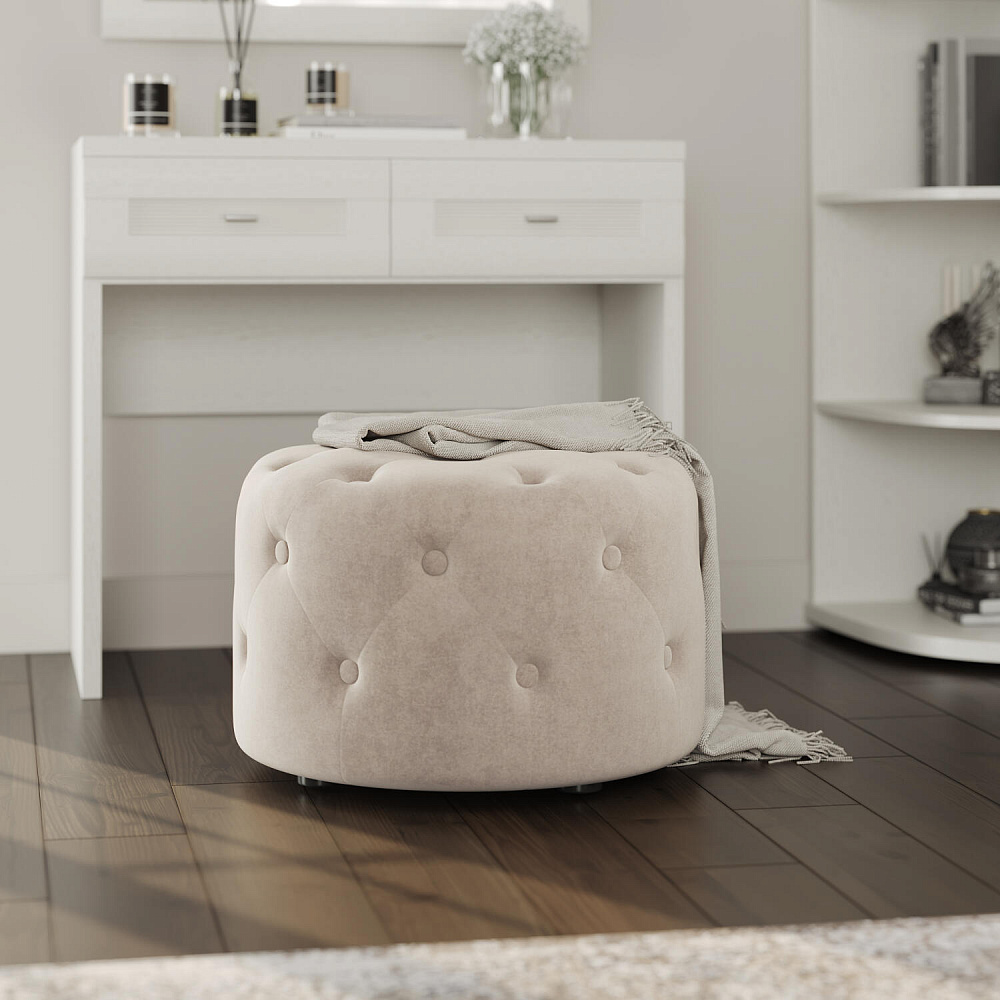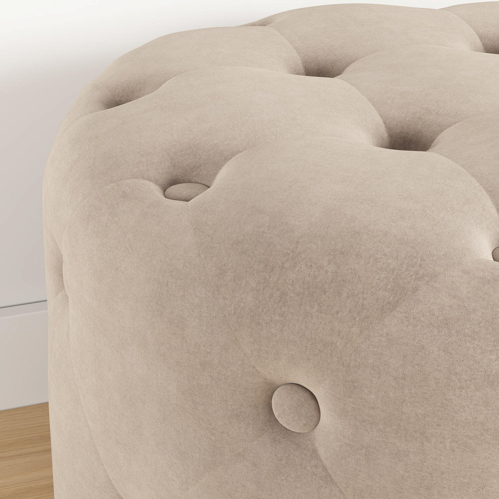 Пуф «Реген» — стильная и мягкая замена стулу в спальне, особенно если необходимо сэкономить место в комнате. Пуф выполнен из тактильно приятного велюра, украшен пуговицами и стяжками. Бархатистая ткань визуально схожа с замшей и обладает высокой устойчивостью к истиранию.