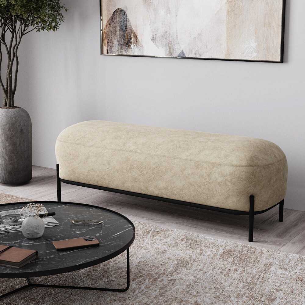 Большой пуф «Луффи» станет лаконичным украшением спальни или прихожей. Округлая форма сиденья дополнена тонким металлическим каркасом на высоких опорах, что наполнит комнату уютом и визуально облегчит интерьер. Пуф можно использовать в качестве дополнения к дивану или креслу из одноименной коллекции.