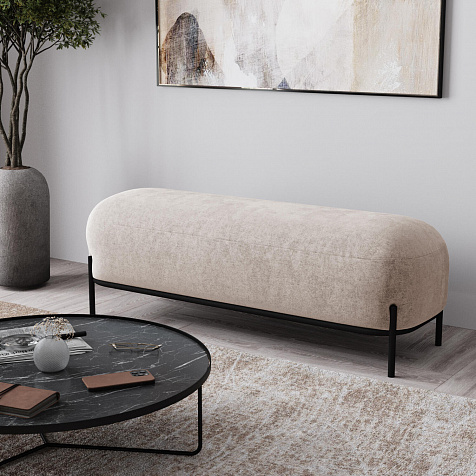 Большой пуф «Луффи» станет лаконичным украшением спальни или прихожей. Округлая форма сиденья дополнена тонким металлическим каркасом на высоких опорах, что наполнит комнату уютом и визуально облегчит интерьер. Пуф можно использовать в качестве дополнения к дивану или креслу из одноименной коллекции.