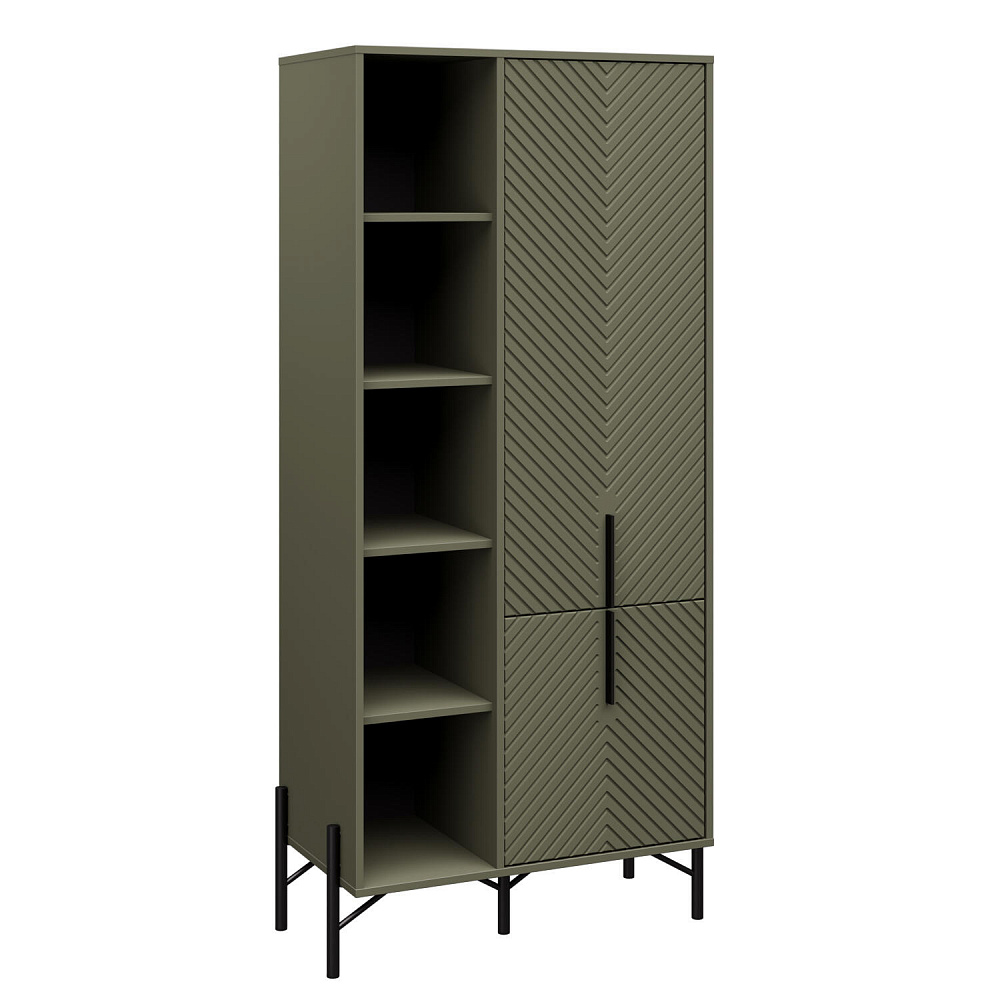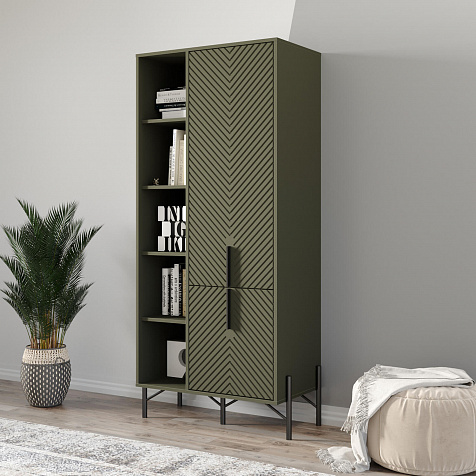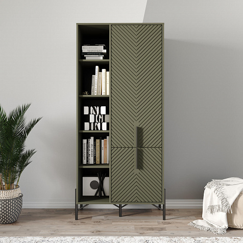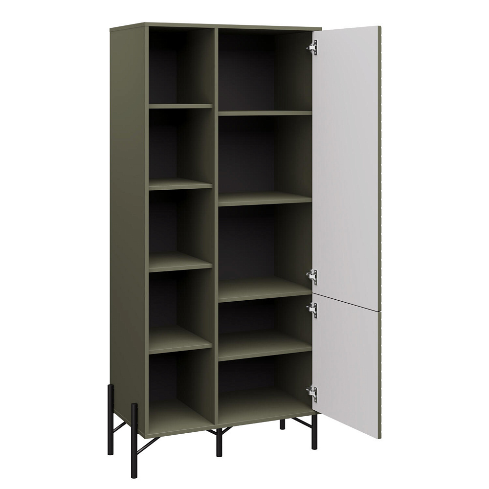 Шкаф-стеллаж «Монтер-Прадо» украсит интерьер в стиле лофт или неоклассика. Матовый корпус в сочетании с фрезерованным фасадом в цвет корпуса дополнен высокими металлическими опорами. В составе мебельной композиции или отдельно шкаф преобразит гостиную и обеспечит удобное хранение вещей в гостиной.