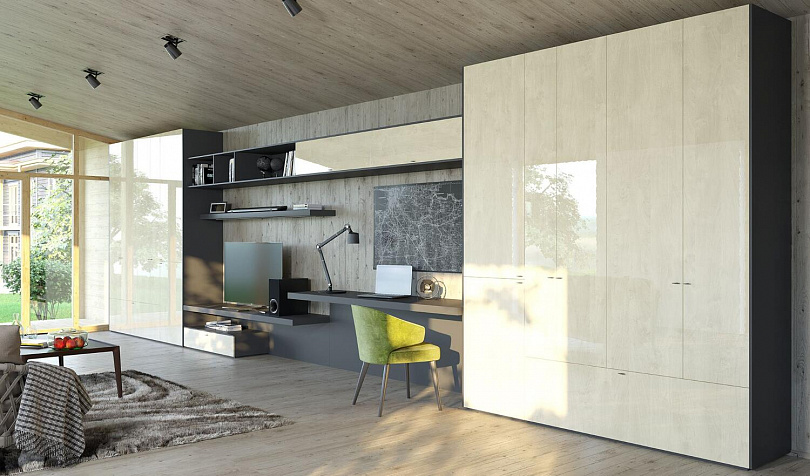 Фасады из ламинированной плиты «Берёза» в отделке прозрачным лаком по программе «СенсоЛайн», тип отделки – «СенсоГлосс» (глянцевая блестящая поверхность, которая при различном освещении создает новое настроение, благодаря отражениям и бликам).