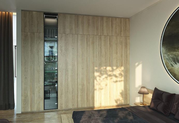Шкаф выполнен из панелей FEELWOOD декора «Дуб Гладстон» (синхронная структура делает поверхность материала практически неотличимой от настоящего дерева).