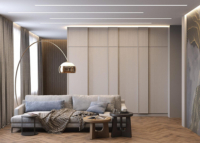 Универсальная система хранения для зонирования пространства, сделанная на заказ по индивидуальным размерам, подойдёт для квартиры-студии или любого другого жилого помещения, которое нужно разделить на 2 функциональные зоны. С одной стороны располагаются закрытые шкафы с рамочными фасадами «Трей» из МДФ в плёнке «Кашемир Эковуд» — они достойно имитируют натуральное дерево и выглядят эстетично. Система открывания — Push-to-Open, благодаря чему можно открыть дверцу лёгким прикосновением к фасаду.