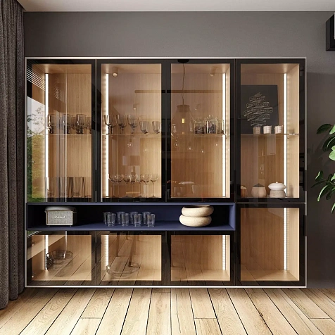Модель сочетается с интерьерами в стиле ар-деко, неоклассика, лофт, но и в современном минимализме будет выглядеть чудесно. Вертикальная LED-подсветка позволяет подчеркнуть содержимое шкафа и добавляет уюта всему помещению — даже верхний свет использовать необязательно.