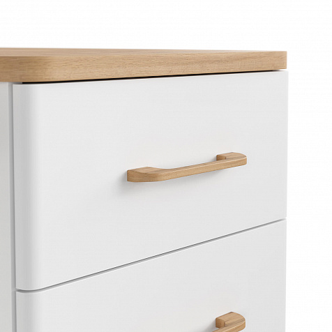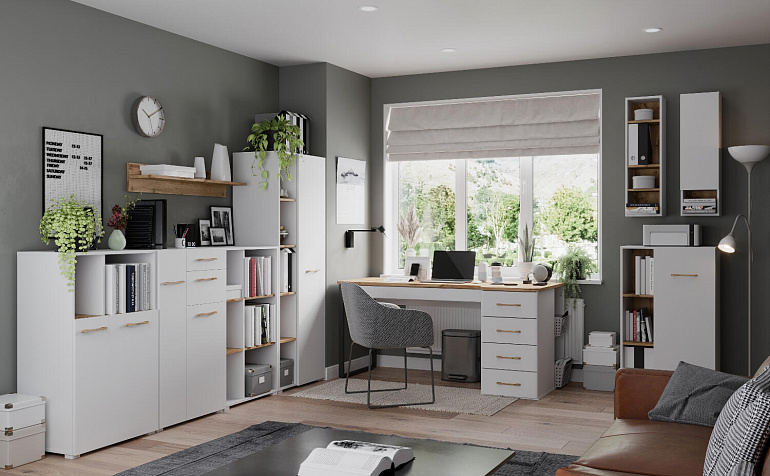 - Приятная цветовая палитра. Белый оттенок корпуса и фасадов разбавлен элементами с текстурой светлого дуба вотан.