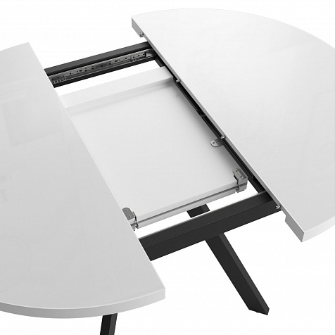 - Раздвижной механизм «бабочка». Боковины столешницы легко раздвигаются в стороны при помощи бесшумных направляющих, из подстолья вынимаются и разворачиваются две вставки из ЛДСтП, в результате чего ширина стола увеличивается на 35 см.