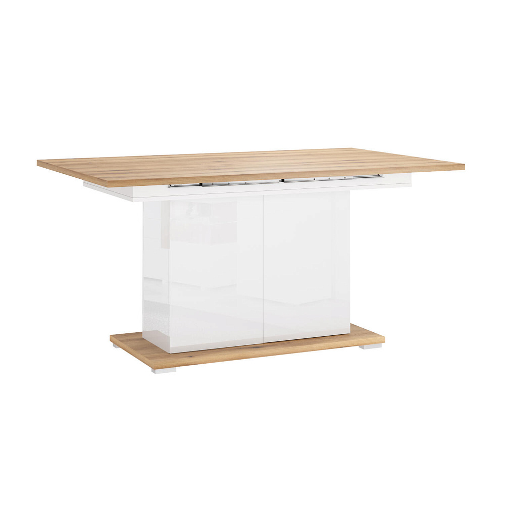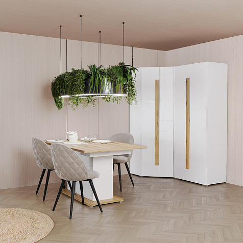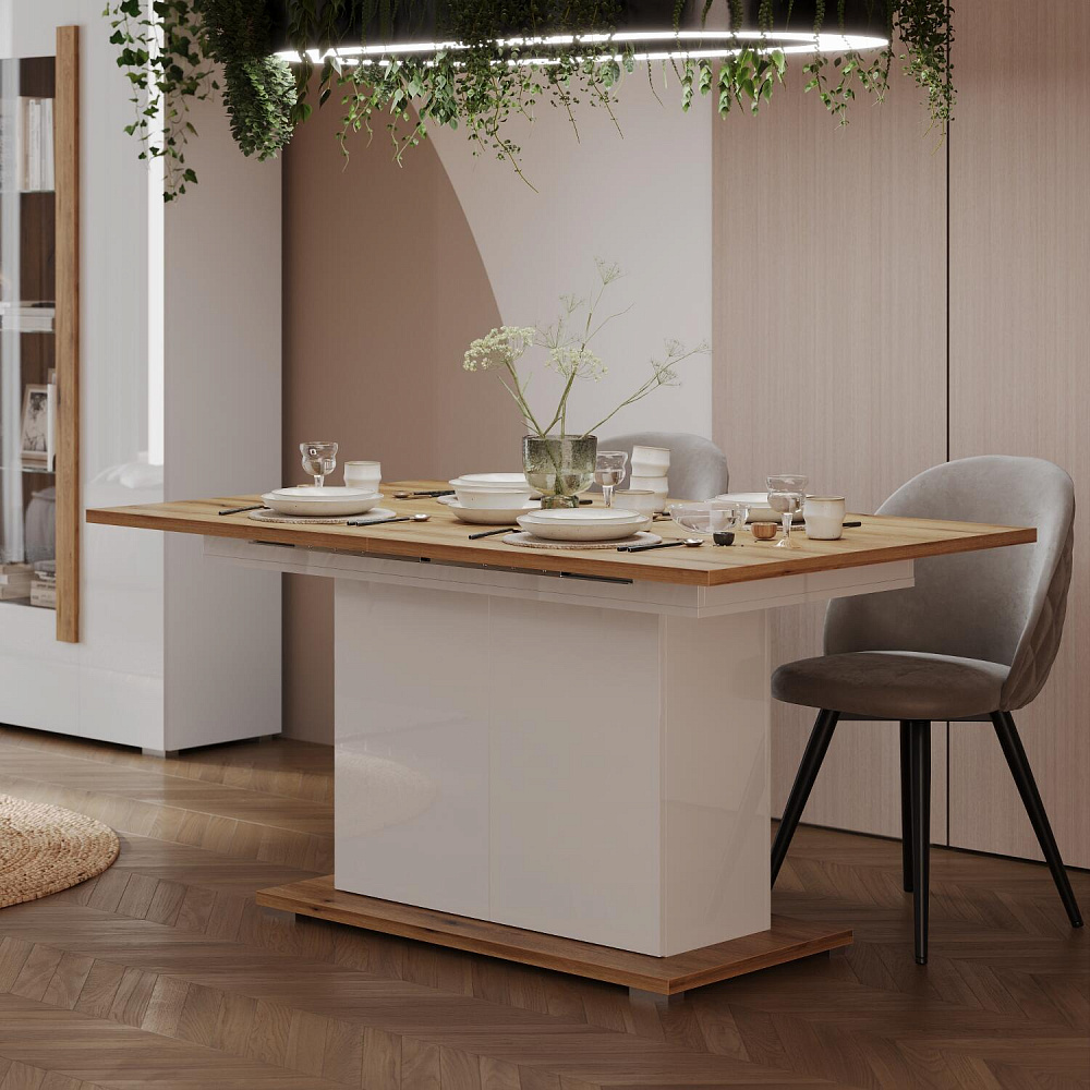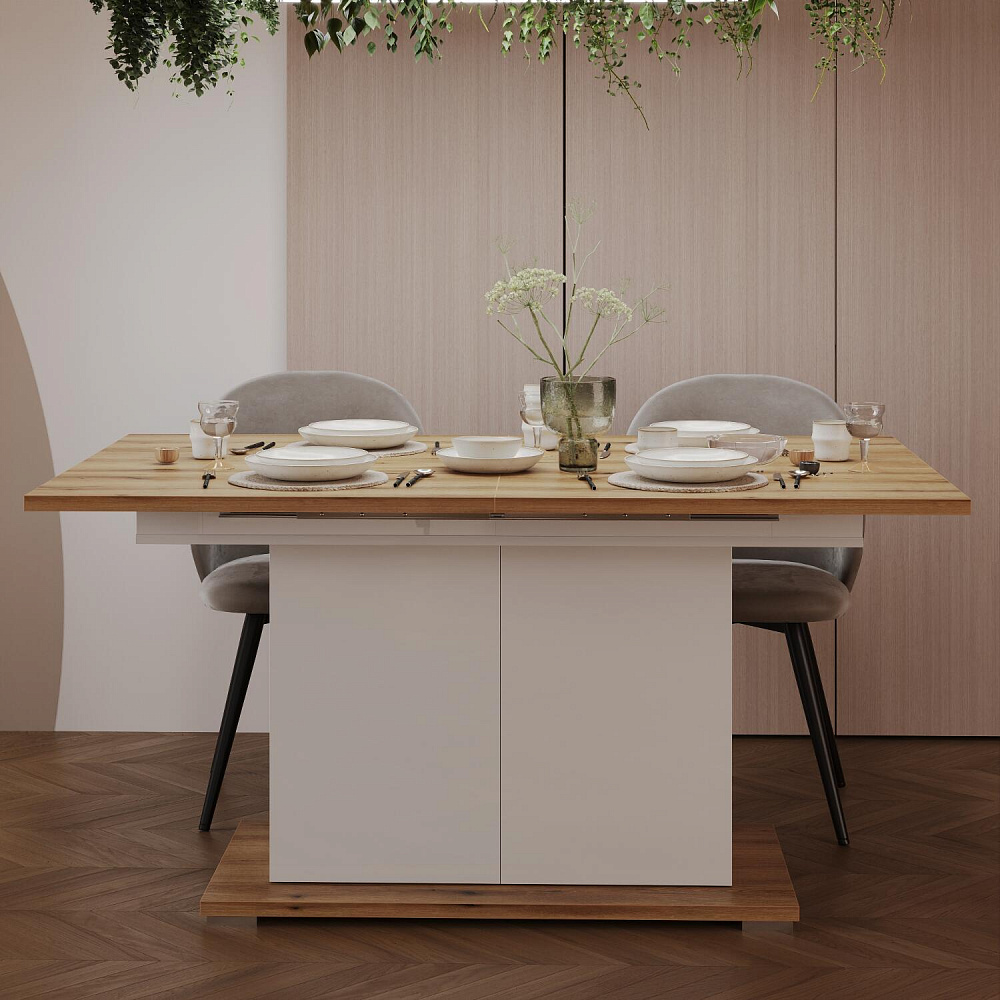 Универсальный раздвижной стол «Вива Элеганте» может быть установлен как в гостиной, так и в столовой. Благодаря трансформируемой конструкции стандартная ширина столешницы может быть увеличена со 150 до 200 см. Такой площади поверхности достаточно для того, чтобы собрать большую семью во время ужина или весёлого застолья с друзьями. Нейтральная цветовая палитра добавит в любой интерьер света, уюта и комфорта.