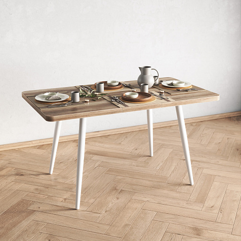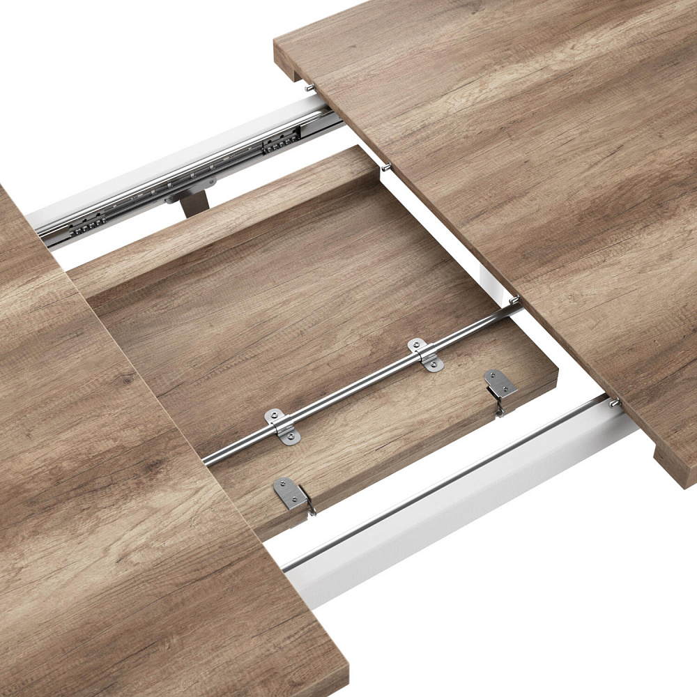 Раздвижной механизм «бабочка». Половинки столешницы отодвигаются в стороны, и внутренняя вставка устанавливается в центре. Стол расширяется на 32 см.