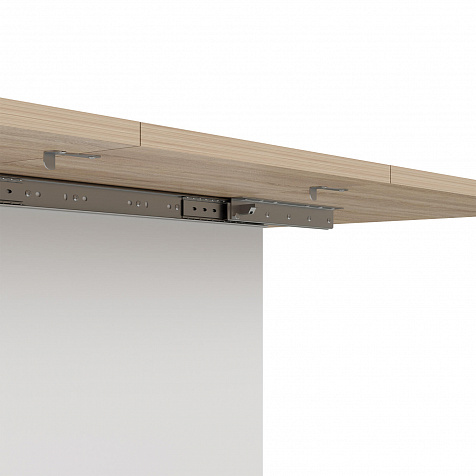 Раздвижной механизм «Центральная вставка». Половинки столешницы синхронно раздвигаются в стороны. Из подстолья вынимается и устанавливается вставка из ЛДСП, позволяя увеличить ширину столешницы со 110 до 152 см.