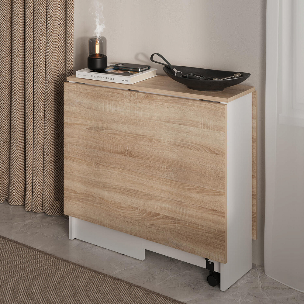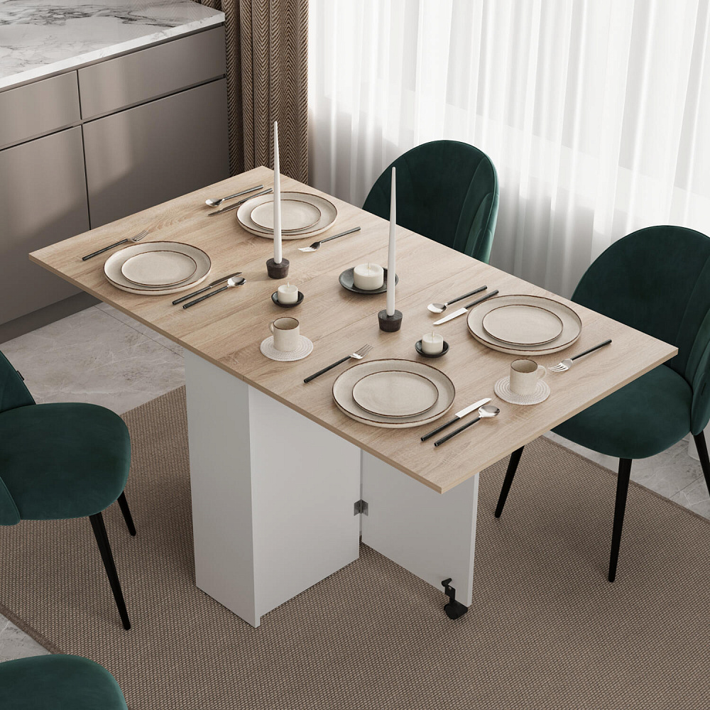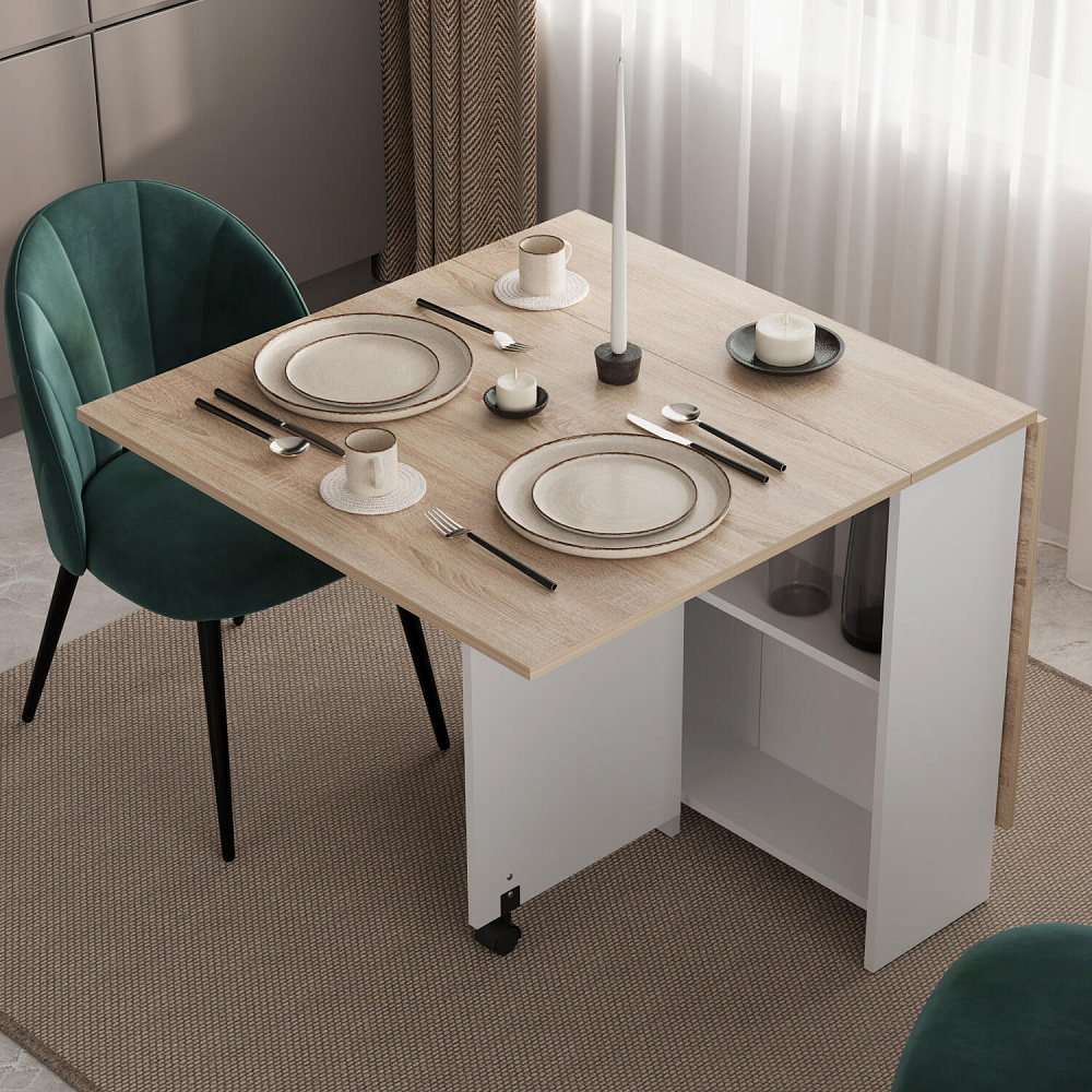 Стол-книжка «Флекс» является универсальным предметом мебели, который может гармонично вписаться и максимально функционально использоваться в любом современном интерьере. Такая модель подойдет для небольших комнат и студий, ведь в сложенном виде стол-книжка занимает минимум пространства и может использоваться как письменный. Для встречи гостей его легко разложить и получить полноценный обеденный стол.