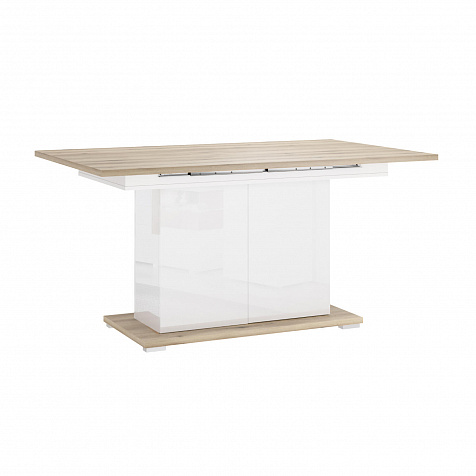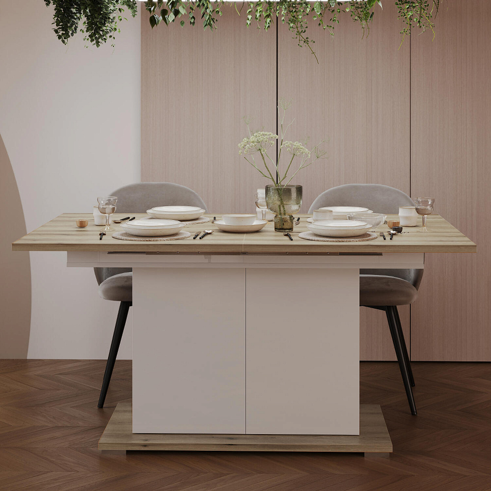 Универсальный раздвижной стол «Вива Элеганте» может быть установлен как в гостиной, так и в столовой. Благодаря трансформируемой конструкции стандартная ширина столешницы может быть увеличена со 150 до 200 см. Такой площади поверхности достаточно для того, чтобы собрать большую семью во время ужина или весёлого застолья с друзьями. Нейтральная цветовая палитра добавит в любой интерьер света, уюта и комфорта.