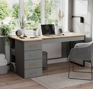 В качестве декора избран благородный «Орех Антик». Каркас большого письменного стола выполнен из ДСП толщиной 25 мм. Просторная столешница обрамлена декоративным рельефным профилем шириной 45 мм. Три рамочные панели, которые мы видим на переднем плане, установленные в качестве задних стенок и дополнительной царги, изготовлены из МДФ и покрыты шпоном натурального дерева (рама). Стол украшен декоративным цоколем и замками.