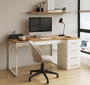 Солидный стол просматривается со всех сторон, поэтому в качестве задних стенок установлены рамочные панели. Две вместительные тумбы расположены по обеим сторонам от сидящего.
