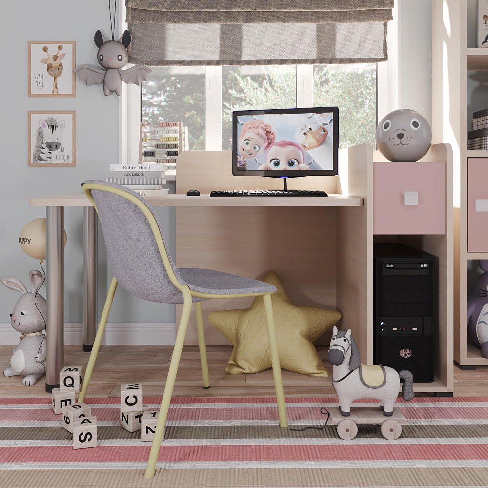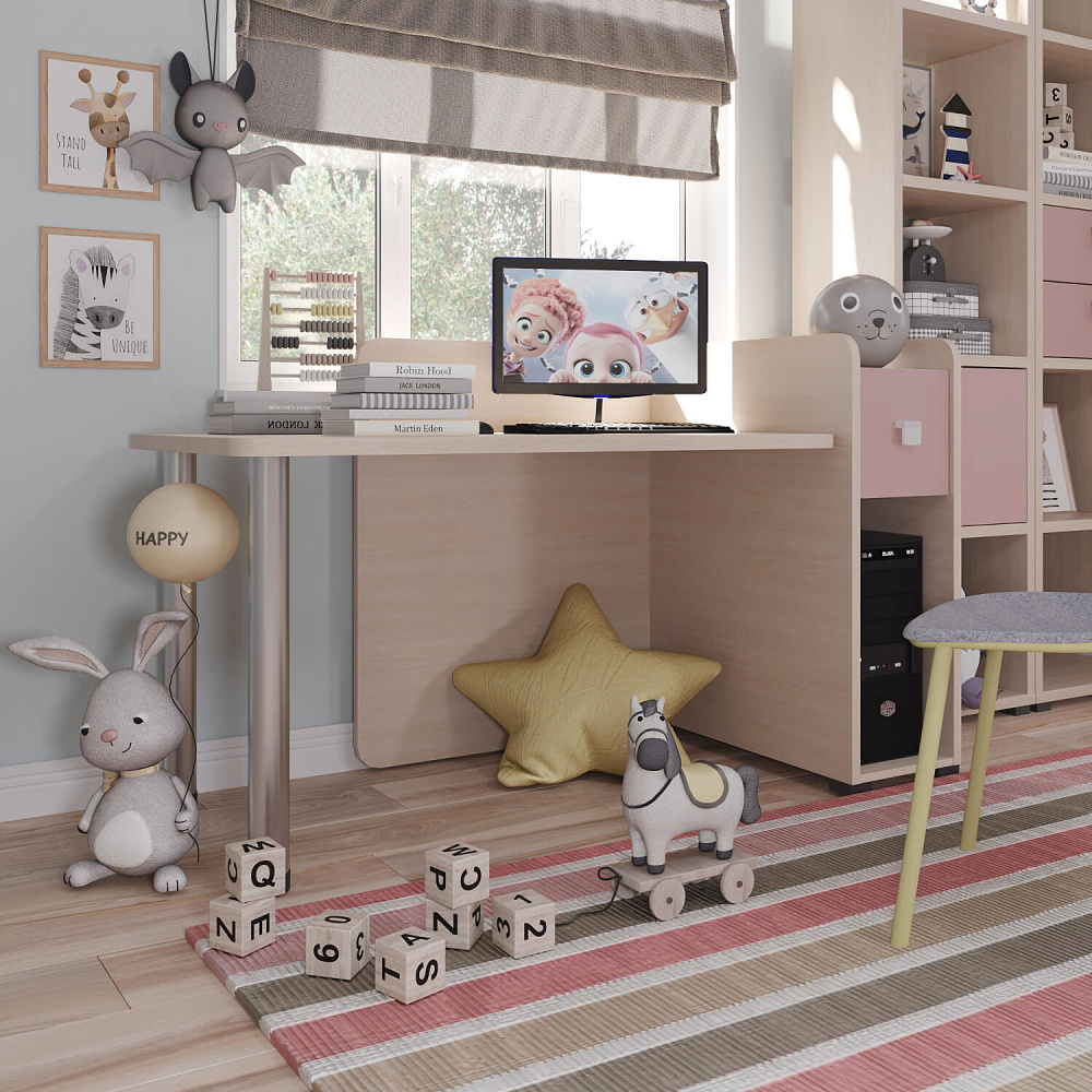 Просторная столешница с отверстием для проводов. Широкая столешница позволяет установить компьютер и разложить необходимые для учёбы и творчества материалы. В крышке стола предусмотрено отверстие для удобного вывода проводов.