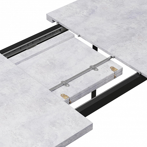 Раздвижной механизм «бабочка». Половинки столешницы отодвигаются в стороны, и внутренняя вставка устанавливается в центре. Стол расширяется на 40 см.