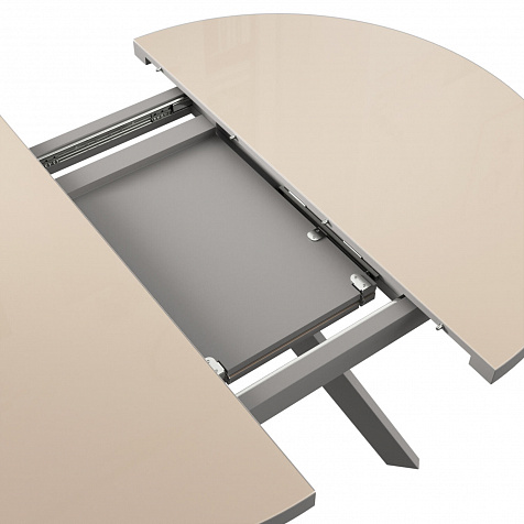 Раздвижной механизм «бабочка». Половинки столешницы отодвигаются в стороны, и внутренняя вставка устанавливается в центре. Стол расширяется на 40 см.