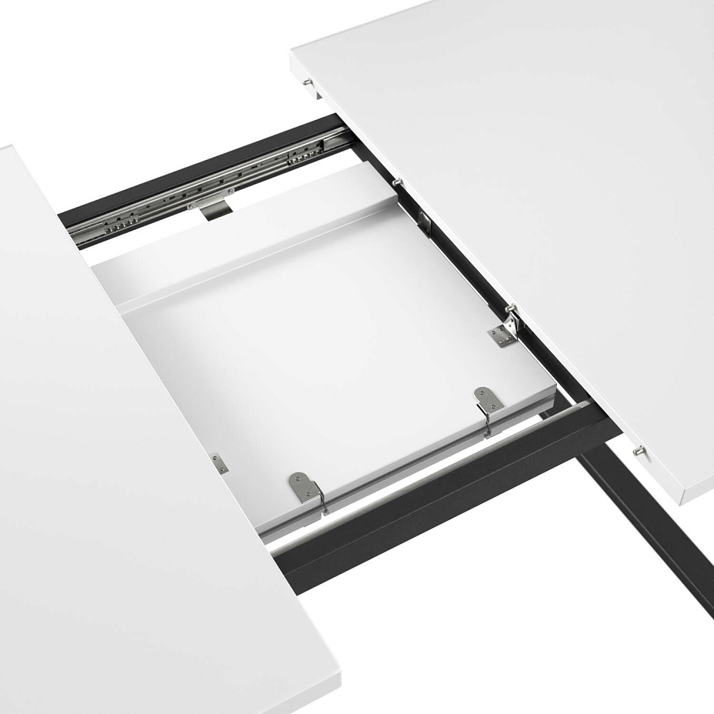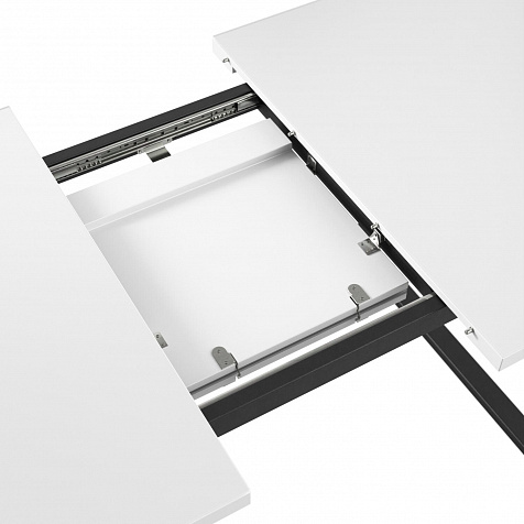 - Раздвижной механизм «бабочка». Боковины столешницы легко раздвигаются в стороны при помощи бесшумных направляющих, из подстолья вынимаются и разворачиваются две вставки из ЛДСтП, в результате чего ширина стола увеличивается на 40 см.