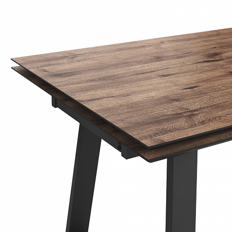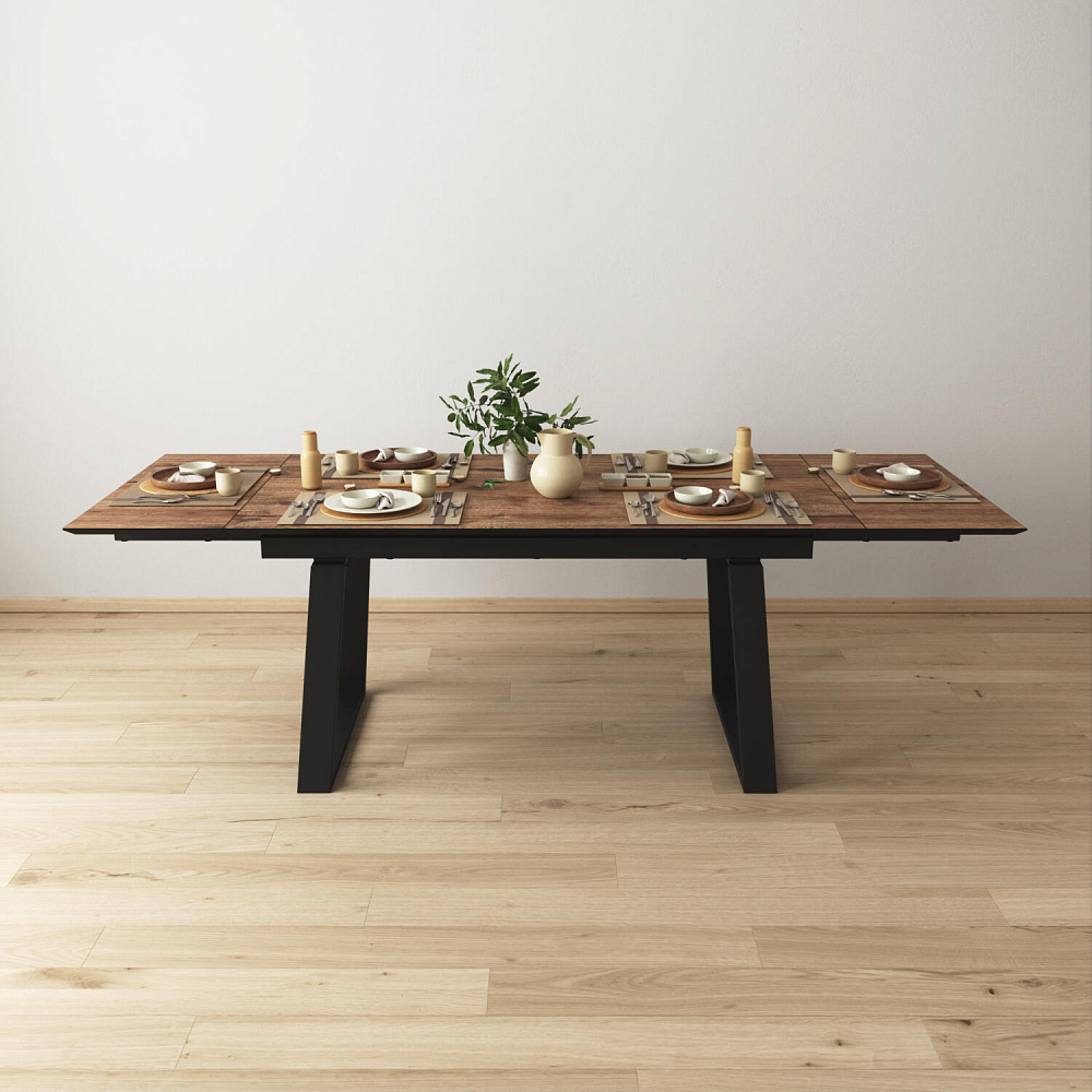 Широкий обеденный стол «Кейптаун» станет главным местом на кухне или столовой благодаря строгому и монументальному дизайну. Массивные металлические опоры в сочетании с природной текстурой столешницы создают стильный образ. Практичная поверхность устойчива к температурным воздействиям. Механизм раскладывания позволяет быстро увеличить базовую ширину столешницы со 160 до 240 см. За широким столом можно будет с легкостью разместить до 10–12 человек.