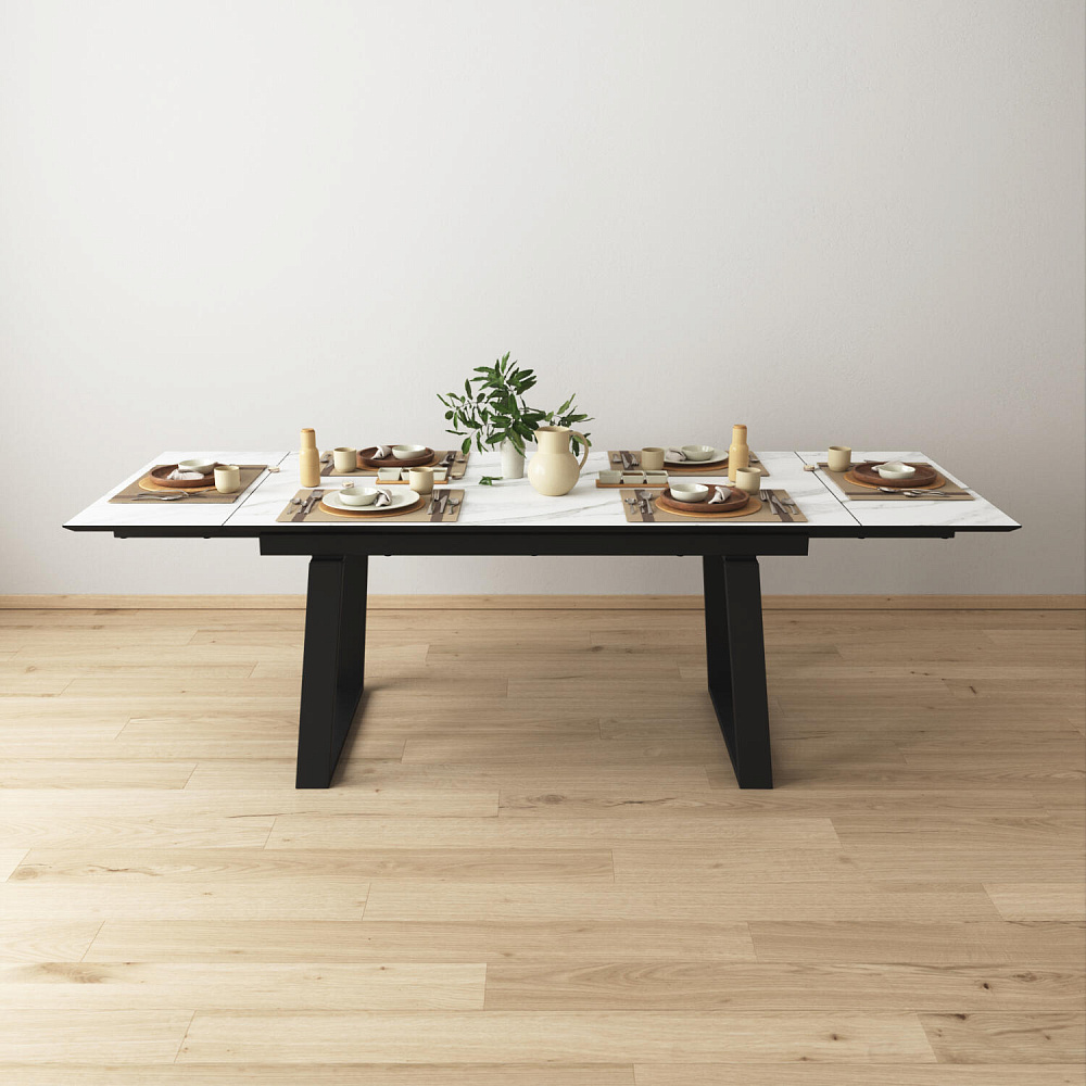 Широкий обеденный стол «Кейптаун» станет главным местом на кухне или столовой благодаря строгому и монументальному дизайну. Массивные металлические опоры в сочетании с природной текстурой столешницы создают стильный образ. Практичная поверхность устойчива к температурным воздействиям. Механизм раскладывания позволяет быстро увеличить базовую ширину столешницы со 160 до 240 см. За широким столом можно будет с легкостью разместить до 10–12 человек.