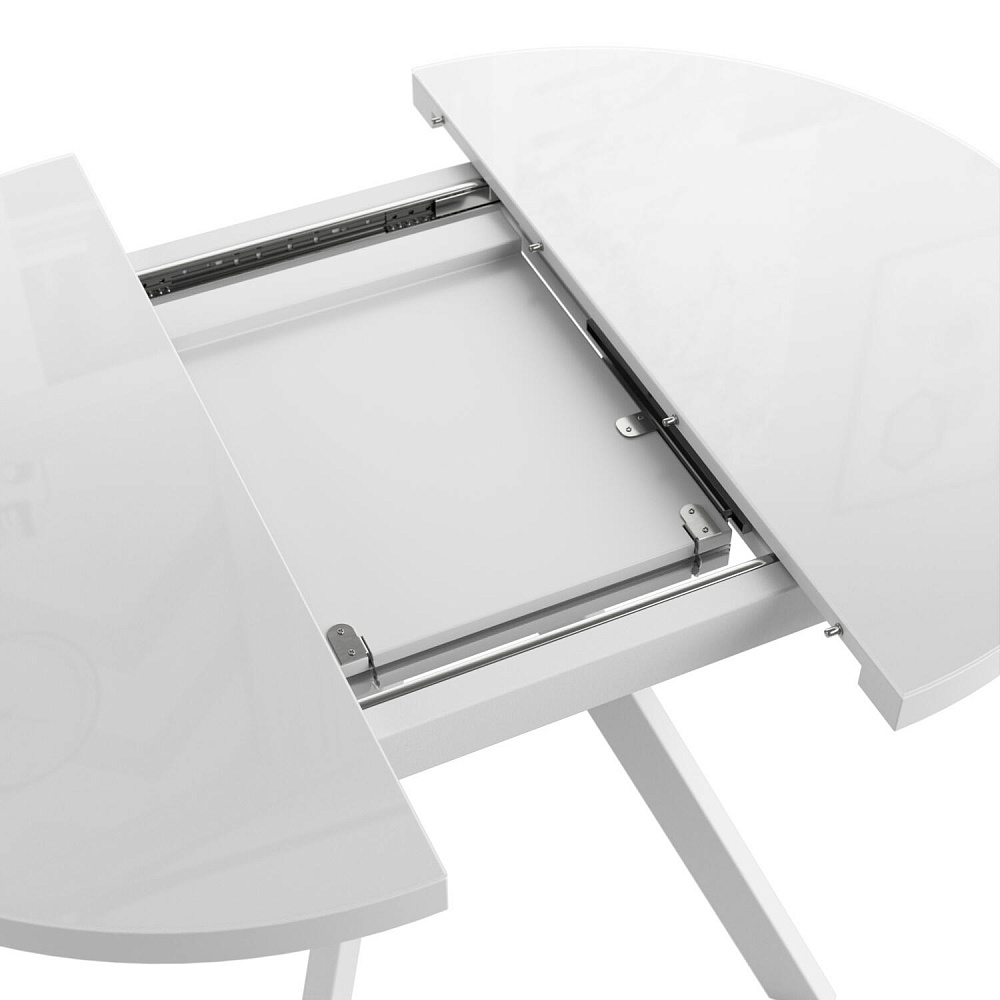 Раздвижной механизм «бабочка». Половинки столешницы отодвигаются в стороны, и внутренняя вставка устанавливается в центре. Стол расширяется на 35 см.